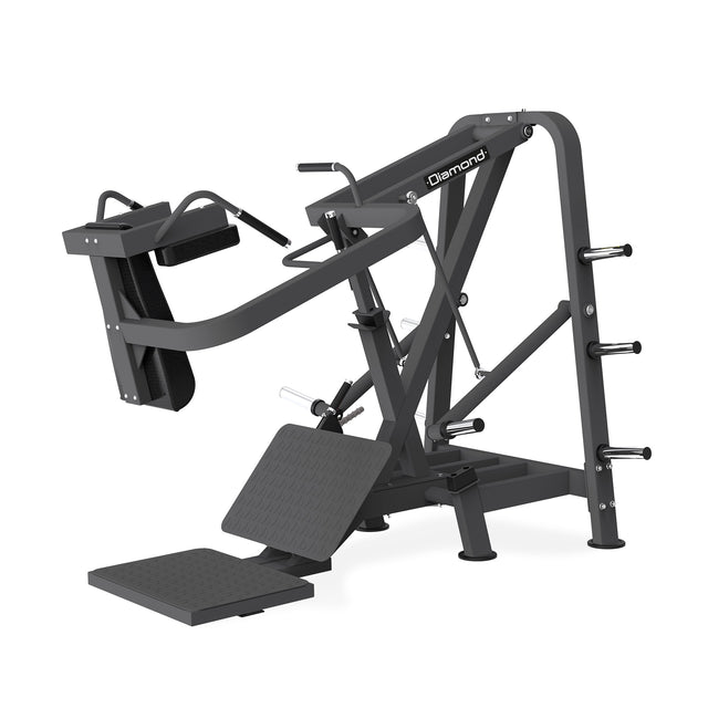 Il Super Squat della linea 500 DIAMOND è un macchinario avanzato progettato per l’allenamento completo della muscolatura delle cosce, con un focus specifico sui quadricipiti. La sua traiettoria guidata, molto simile a quella espressa nei più comuni Pendulum Squat, offre un movimento unico, combinando i benefici dello squat con quelli della leg press a 45°, garantendo un’esecuzione sicura ed efficace. Il controbilanciamento a molla riduce il peso iniziale della macchina, rendendola accessibile anche a utenti principianti o con esigenze specifiche. La pedana ampia e sicura realizzata in materiale antiscivolo, garantisce una posizione stabile durante ogni ripetizione, inoltre è regolabile su diverse inclinazioni per fornire il massimo stimolo allenante. Grazie alla traiettoria guidata e alle leve di sicurezza, l’utente può allenarsi in tutta tranquillità, riducendo il rischio di infortuni. Questo strumento rappresenta una scelta ideale per chi cerca un allenamento mirato e sicuro, con un design ergonomico e una qualità costruttiva superiore. 6 perni porta pesi per una gestione pratica ed ordinata dei dischi.