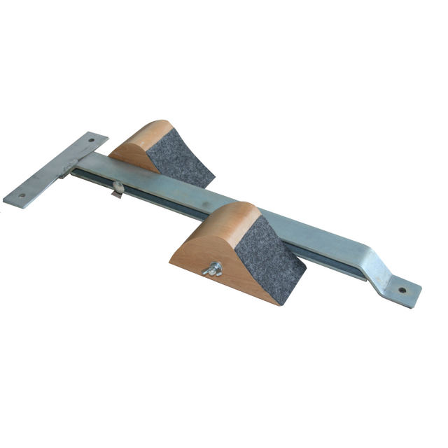 Blocco di partenza ambidestro a due ceppi, in legno sagomato, superficie di appoggio ricoperta in materiale sintetico, con piastra traversale per partenza da fondo palestra.