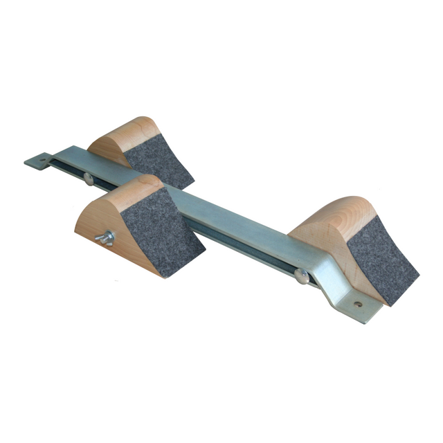 Blocco di partenza ambidestro regolabile a tre ceppi, in legno sagomato, superficie di appoggio ricoperta in materiale sintetico.