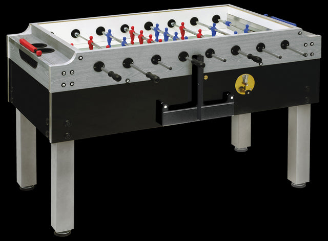 Riprende i colori del World Champion (modello d'elezione per i tornei internazionali) questo calciobalilla con mobile che abbina il nero lucido nella parte inferiore alle venature del rovere grigio nella parte superiore.