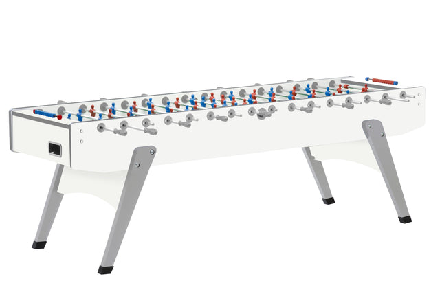 Calciobalilla extralarge, per 8 giocatori, offre un divertimento doppio con azioni ancora più entusiasmanti, favorite dall’esteso campo gioco. Il mobile riprende l’elegante linea del G-2000, in colore bianco, slanciato dalle gambe inclinate. Adatto a far giocare gruppi numerosi, XXL ben si presta all’utilizzo in eventi di richiamo e per fini pubblicitari. Nella versione a richiesta con aste telescopiche di sicurezza che non fuoriescono dal mobile offre un’elevata protezione per il viso e gli occhi dei bambini. XXL è conforme alle norme europee sulla sicurezza dei giocattoli.