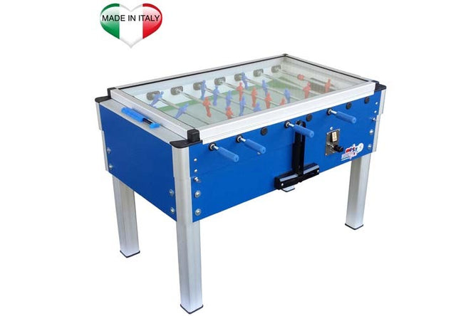 Calciobalilla professionale con gettoniera e con il campo di gioco protetto da una lastra di vetro. Il campo di gioco è completamente protetto da una copertura di vetro che evita la fuoriuscita della pallina dal campo di gioco, riduce il rumore e rende impossibile appropriarsi delle palline, anche grazie alla presenza di un sistema per il lancio guidato delle palline. Disponibile in tre colori: nero, blu e legno.