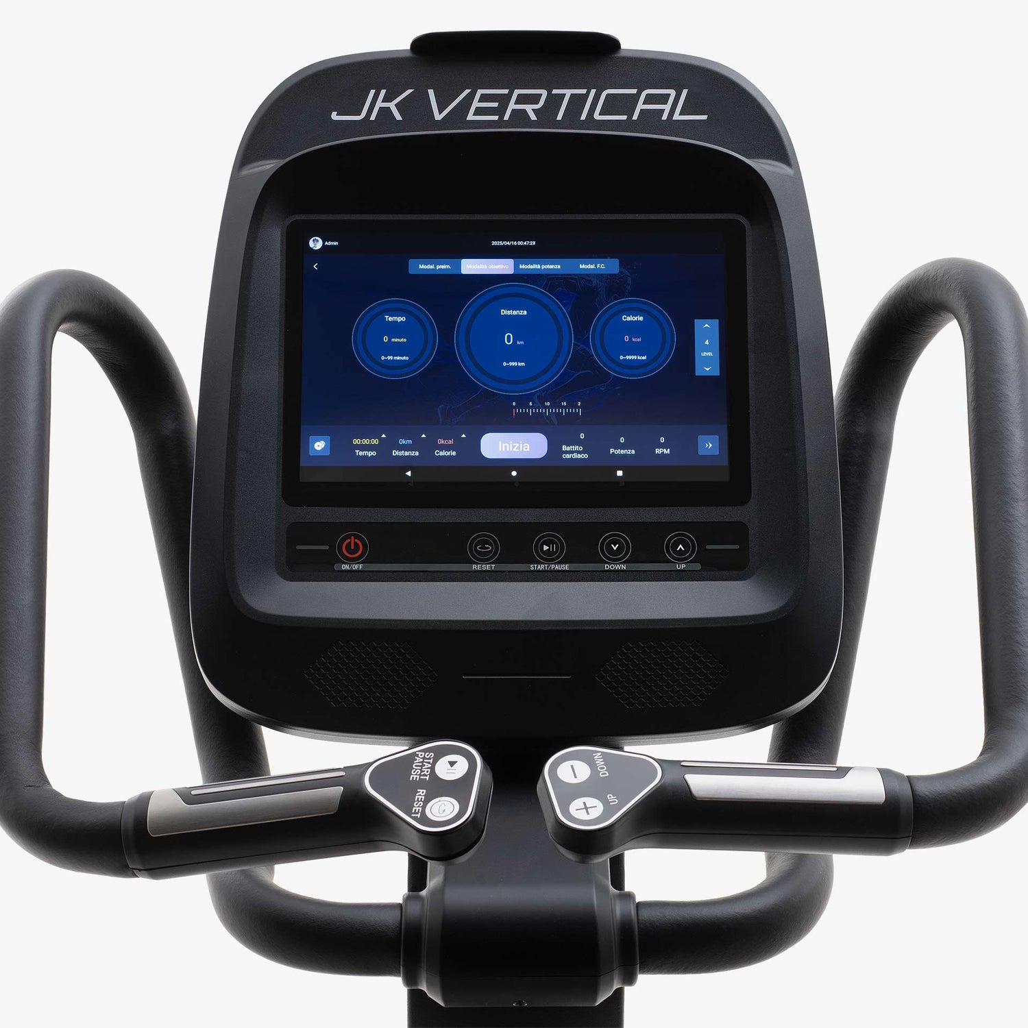 La JKV26 TFT è una cyclette ergometro di fascia alta nel mondo vertical equipaggiata con un sistema frenante magnetico ad induzione con una massa volanica da 14 kg bilanciata e pedivella da 17 cm, che permettono una pedalata fluida e piacevole ad ogni andatura. La regolazione dello sforzo avviene mediante un sistema elettronico comandato da tasti sulla console con ben 32 livelli di resistenza. La cyclette JKV26 TFT grazie alle ampie regolazione permette di ospitare a bordo persone molto alte. I dati della regolazione in profondità del sedile permettono una estensione della gamba da 72 cm a 91 cm e una distanza sedile manubrio da 33 cm a 44 cm, questi dati confermano l’ottima ergonomia della cyclette. Il sedile ergonomico è molto comodo, con una imbottitura a compressione graduata che aiuta e mantenere la corretta posizione per lunghe pedalate, la regolazione è rapida con selettore a scatto e servo pistone; il tutto per garantire piacevoli allenamenti cardio in pieno comfort. Il pedale antiscivolo autolivellante con cinghietto ferma piede aiuta a mantenere la corretta posizione della scarpa in tutte le fasi dell’esercizio. La cyclette JKV26 TFT con ricevitore incorporato può collegarsi alle più importanti APP del mondo fitness (Zwift – Kinomap) per rendere più divertente l’allenamento cardio, pedalando in giro per il mondo! La console, con un pratico supporto porta cellulare/tablet a scomparsa, è dotata di uno schermo TFT 10” touch-screen per visualizzare il profilo dei programmi; i dati forniti dal display sono: tempo, distanza, velocità, RPM, calorie, Watt, frequenza cardiaca, livello resistenza, n° programma, diagramma programma. Il sistema operativo dello schermo TFT è Android con connessione wi-fi e sono preinstallate alcune app: Chrome -You Tube – You Tube Music – Google Play – Movies & TV. La consolle della nuova cyclette JKV26 TFT è dotata di programmi per rendere gli allenamenti più divertenti; 1 programma manuale gestito manualmente dall’utilizzatore, 1 programma a target tempo-distanza-calorie, 12 programmi preimpostati con differenti profili della resistenza per ogni segmento, 4 programmi HRC (55% 75% 85% 95%+ 1 target BPM), 1 programma a Watt costanti. La cyclette è dotata di due sensori grip pulse sul manubrio e del sensore integrato per la ricezione dalla fascia cardio per rilevare la frequenza cardiaca dell’utilizzatore durante le sessioni di allenamento più intense. La fascia cardio toracica wireless di serie. Lo stabile telaio della JKV26 TFT poggia su ampi stabilizzatori con 4 tamponi autolivellanti che permettono di sopportare un peso max utilizzatore di 145 kg; nella parte anteriore sono posizionate 2 rotelle di trasporto, che facilitano l’utilizzatore negli spostamenti della cyclette. La JKV26 TFT è una cyclette che pesa 57 kg e misura 115 x 57 cm H 157 cm; in pratica perfetta per chi vuole la massima prestazione ma non dispone di ampi spazi. JK Fitness offre le migliori cyclette sul mercato con un perfetto rapporto qualità/prezzo.