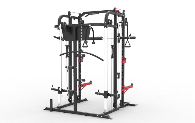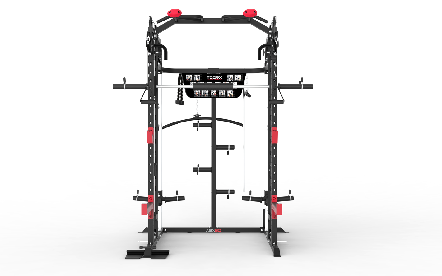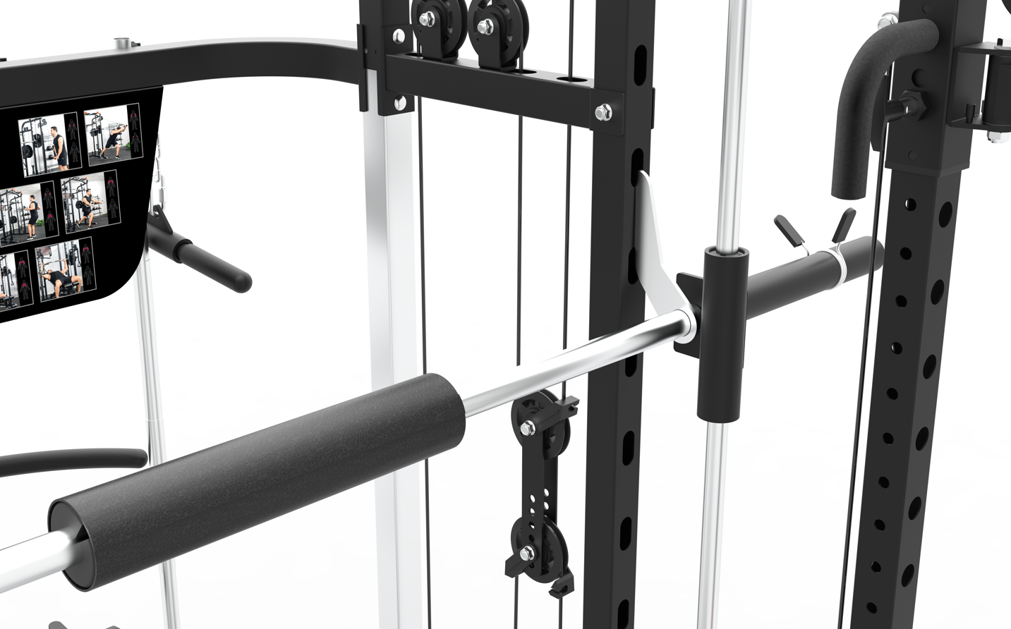 DOTAZIONE 3-IN-1 dual pulley&row, smith machine, rack. Sistema di carico dischi ø50 mm e ø25 mm. 1 Squat bar, 2 J-hooks, coppia fermi di sicurezza bilanciere, barbell storage, barra trazioni multipresa, 4 ganci per fasce elastiche, 8 porta dischi ø50 mm e ø25 mm, 12 ferma dischi a molla ø49 mm e 4 ø25 mm. Attachments: cavigliera, corda doppia tricipiti, catena, landmine, 2 maniglie trazioni, barra lat e barra corta dritta incluse