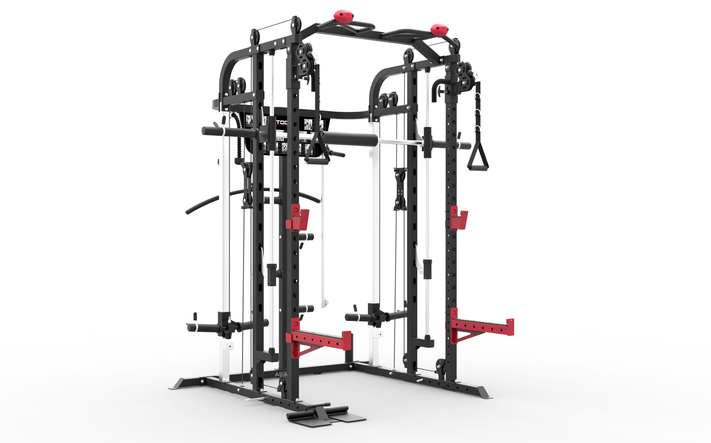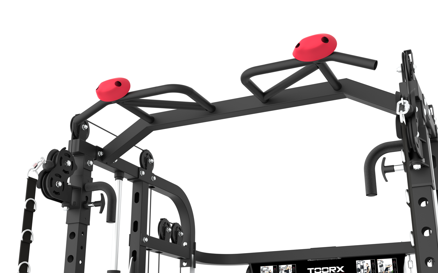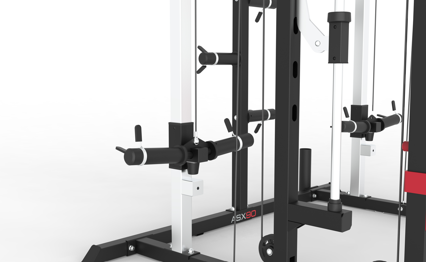 DOTAZIONE 3-IN-1 dual pulley&row, smith machine, rack. Sistema di carico dischi ø50 mm e ø25 mm. 1 Squat bar, 2 J-hooks, coppia fermi di sicurezza bilanciere, barbell storage, barra trazioni multipresa, 4 ganci per fasce elastiche, 8 porta dischi ø50 mm e ø25 mm, 12 ferma dischi a molla ø49 mm e 4 ø25 mm. Attachments: cavigliera, corda doppia tricipiti, catena, landmine, 2 maniglie trazioni, barra lat e barra corta dritta incluse