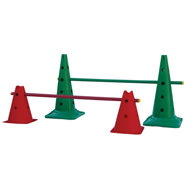 Giochi educativi: ostacolo composto da 2 coni forati ed asta in PVC da 100 cm, altezza 50 cm.
