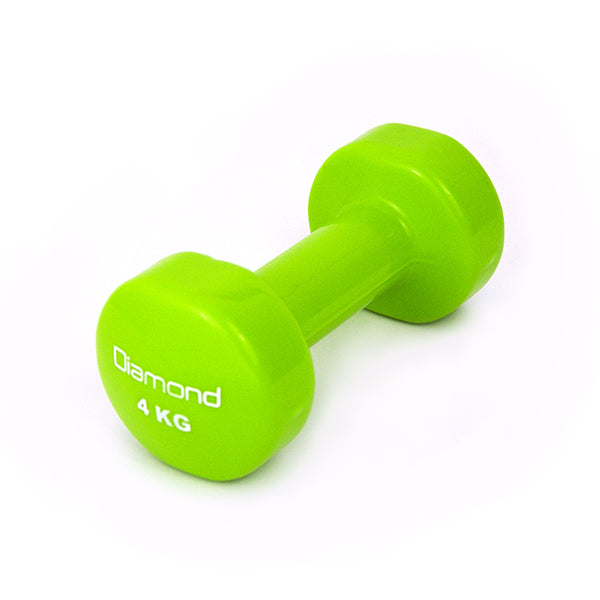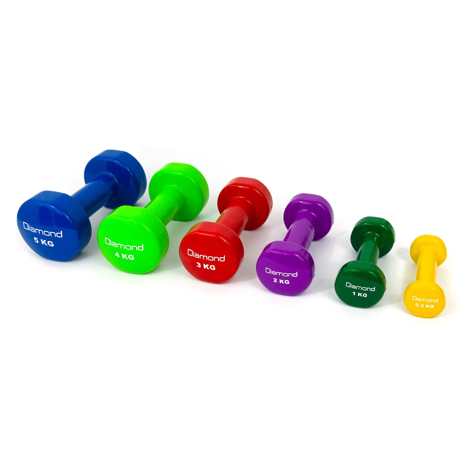I manubri in vinile Diamond si distinguono per il colore del rivestimento in quanto ogni taglia è caratterizzata da un colore differente che riporta la scritta del peso sul lato. Lo strato di vinile rende il manubrio comodo nella presa e il particolare design permette di appoggiarlo a terra senza recare danni alle superfici di appoggio.