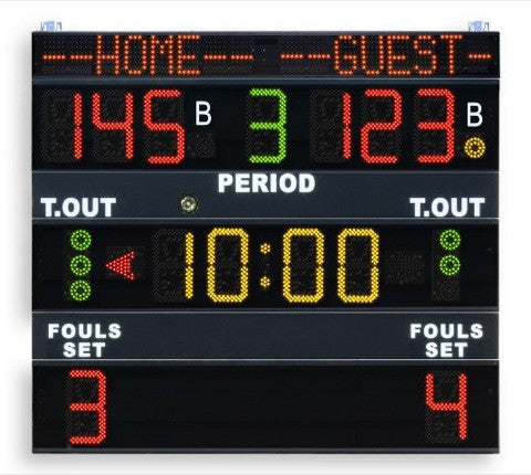 Tempo di gioco: [00:00 - 99:59], cifre alte 30cm. Inoltre visualizza i set/game vinti [0 - 4] nella pallavolo e tennis.