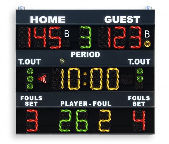 Tempo di gioco: [00:00 - 99:59], cifre alte 30cm. Inoltre visualizza i set/game vinti [0 - 4] nella pallavolo e tennis.