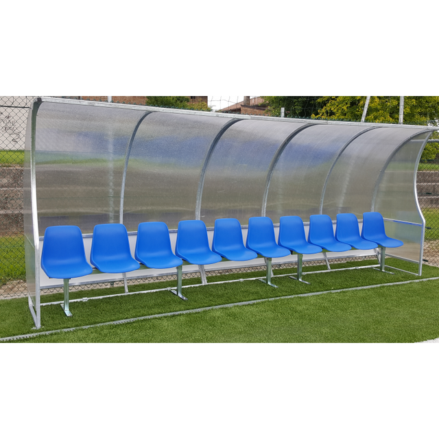 Panchina per allenatori/riserve gioco calcio modulare, componibile ed ampliabile in ogni momento, lunghezza m. 5; struttura in tubolare d'acciaio zincato a caldo sezione mm 30x30, copertura in policarbonato alveolare mm 6 con protezione anti UV, telaio di seduta in tubolare d'acciaio zincato sezione mm 50x30 e lamiera porta scocca spessore 20/10, fissaggio a terra tramite appositi profili ad Omega in acciaio zincato.