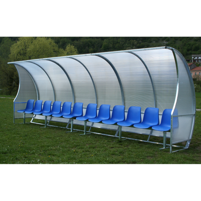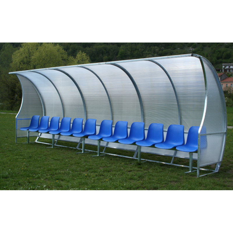 Panchina per allenatori/riserve gioco calcio modulare, componibile ed ampliabile in ogni momento, lunghezza m. 6; struttura in tubolare d'acciaio zincato a caldo sezione mm 30x30, copertura in policarbonato compatto mm 3 con protezione anti UV, telaio di seduta in tubolare d'acciaio zincato sezione mm 50x30 e lamiera porta scocca spessore 20/10, fissaggio a terra tramite appositi profili ad Omega in acciaio zincato. Panca completa di 12 scocche in materiale plastico. Bulloneria di assemblaggio 8.8. Ingombro totale m. 6x1,20x2,00h.