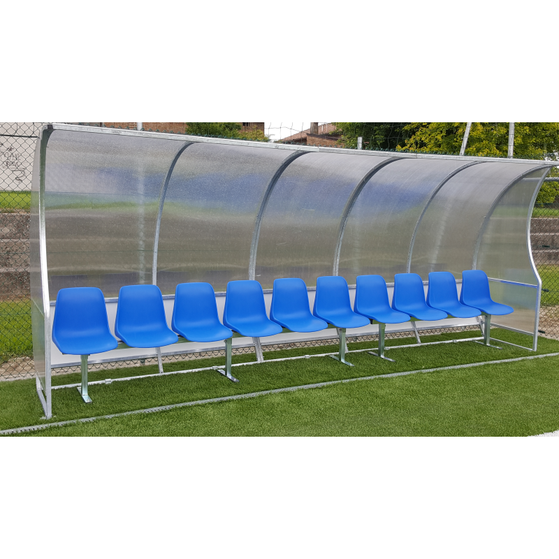 Panchina per allenatori/riserve gioco calcio modulare, componibile ed ampliabile in ogni momento, lunghezza m. 5; struttura in lega leggera sezione mm 30x30 spessore 2, copertura in policarbonato compatto mm 3 con protezione anti UV, telaio di seduta in tubolare d'acciaio zincato sezione mm 50x30 e lamiera porta scocca spessore 20/10, fissaggio a terra tramite appositi profili ad Omega in acciaio zincato.