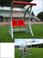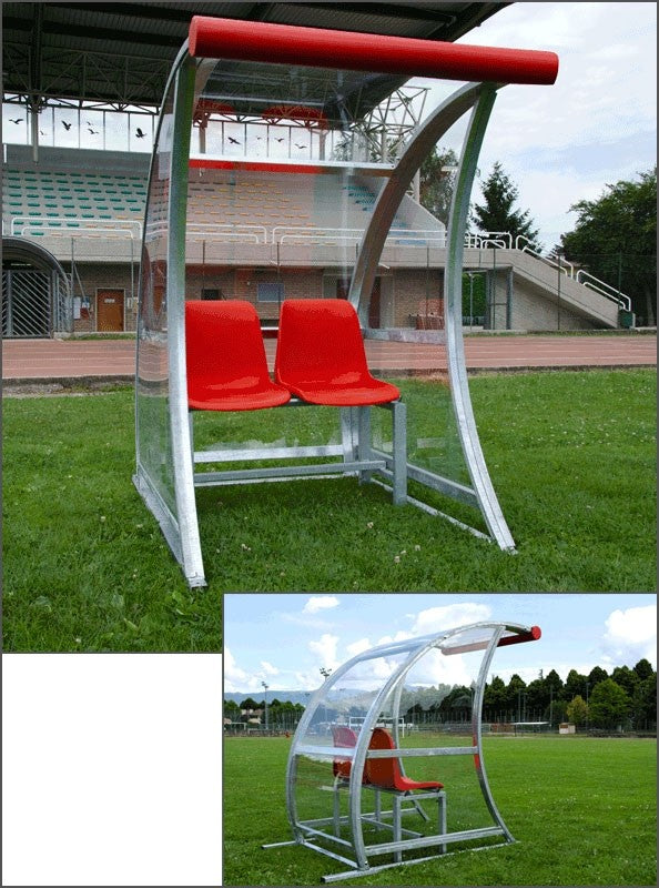 Panchina riserve e allenatori ad altezza ridotta (cm 165), struttura di acciaio zincato, pannelli di policarbonato trasparente mm 3, sedute a scocche di polipropilene, protezione paraspigoli.