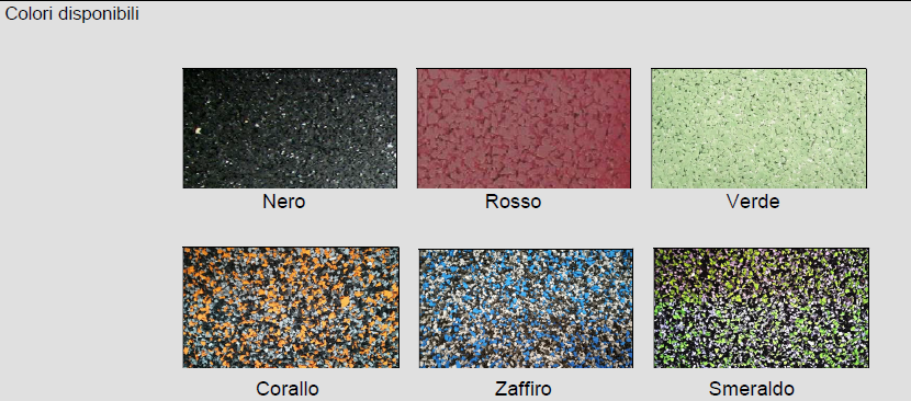 Strato superficiale in agglomerato di granuli di gomma con finitura in epdm colorata in massa miscelati a granuli sbr nero per alcune finiture