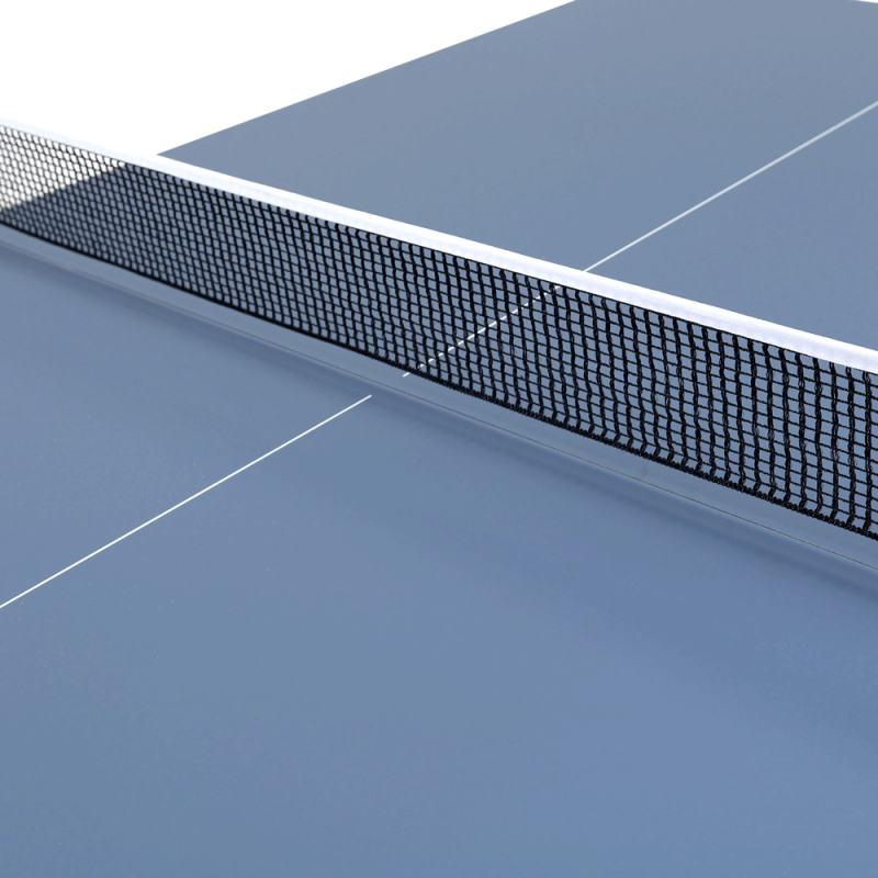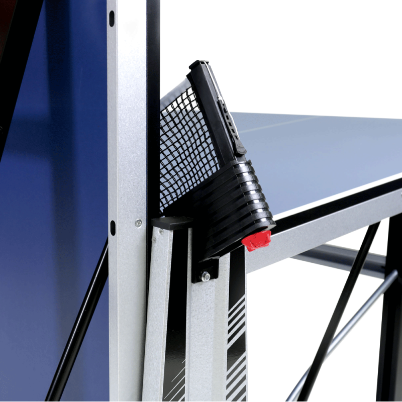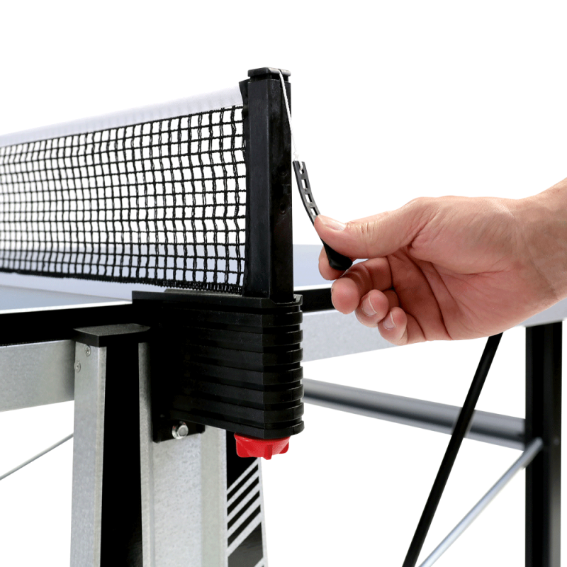 - Siate precisi con la competizione 540 ITTF Indoor. Quando si apre il tavolo, i pali della rete si aprono automaticamente. Scegliete l'altezza giusta per giocare utilizzando la rotella alla base della rete. Quindi regolate la tensione semplicemente tirando il filo e bloccandolo con la linguetta. Con la rete sistemata, siete pronti a giocare.