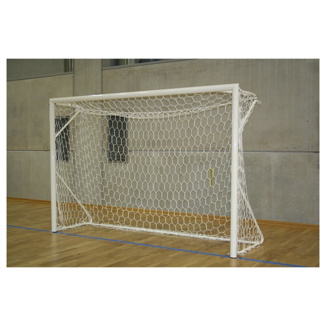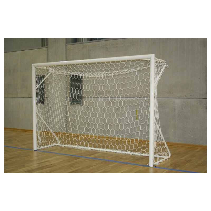 Coppia porte calcetto regolamentari trasportabili, struttura in tubolare d'acciaio verniciato diam. mm.80, reggirete posteriori in acciaio Ø 30 zincato a caldo. Dimensioni cm. 300x200. Reti escluse. Porte calcetto certificate secondo norma UNI EN 749.