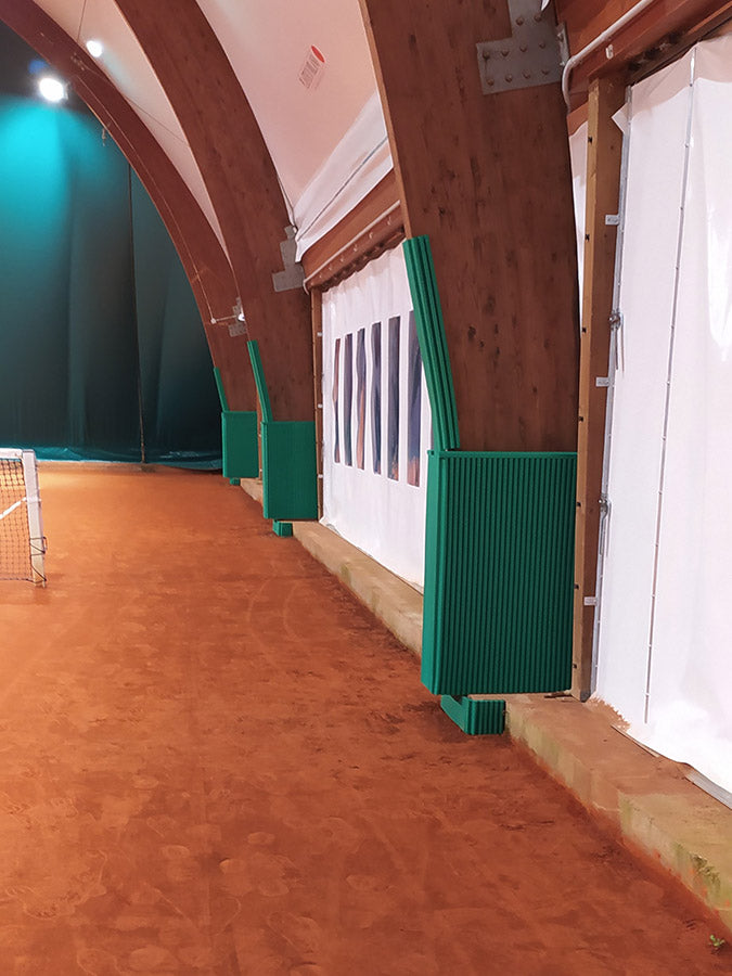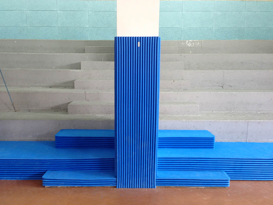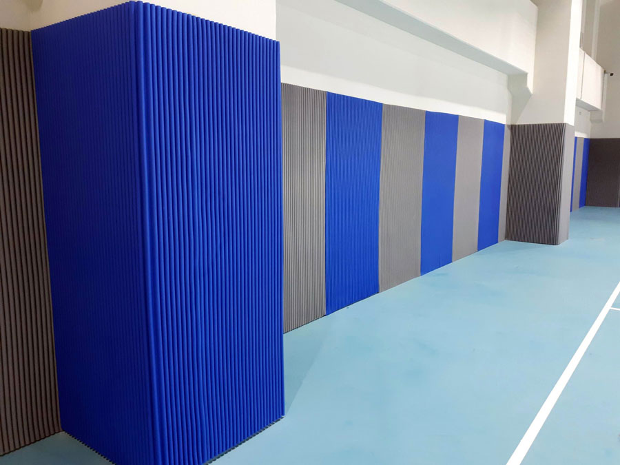 Onda (sp.22mm) e Maxionda (sp.28mm) sono due pannelli protettivi ideali per il rivestimento di colonne e pilastri negli impianti sportivi indoor e outdoor. Essi infatti sono disponibili nella versione atossica (per esterno) o nella versione ignifuga Cl.1 (per interno) per tutta la gamma di colori.