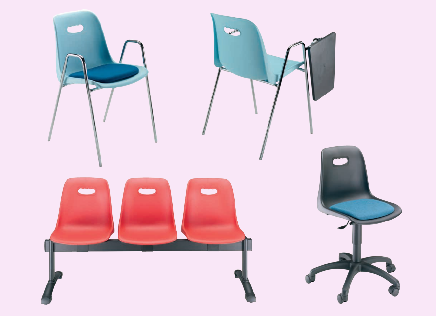 La scocca prodotta con polipropilene di prima scelta è disponibile in una vastissima gamma di colori, è possibile applicare sul sedile un pannello imbottito con rivestimento in tessuto.