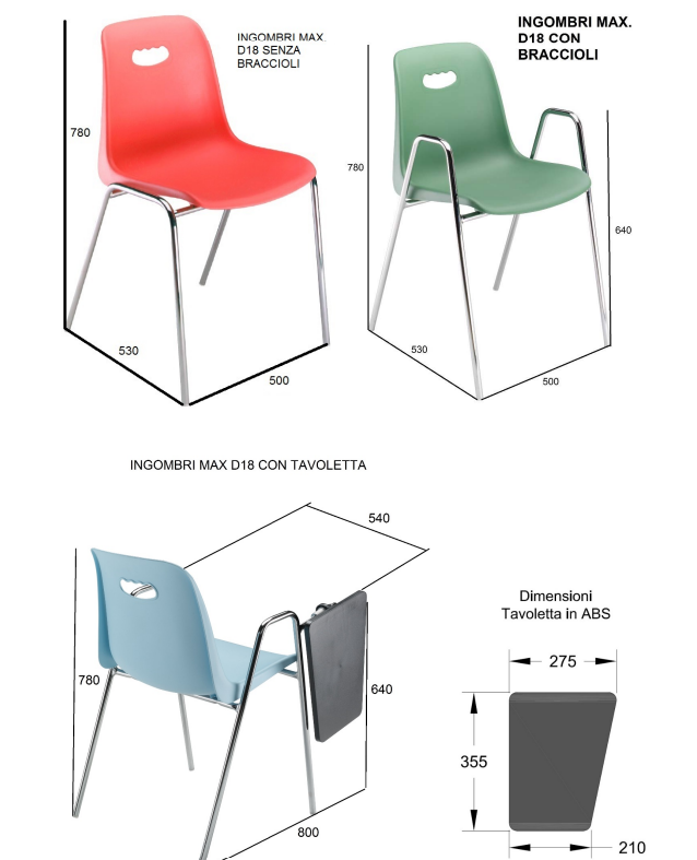 D18 può essere fornita con telaio a 4 gambe di diametro 18 mm, con o senza braccioli, con sistema di aggancio, con base girevole e con tavoletta scrittoio ideale per l’utilizzo in sale conferenza.