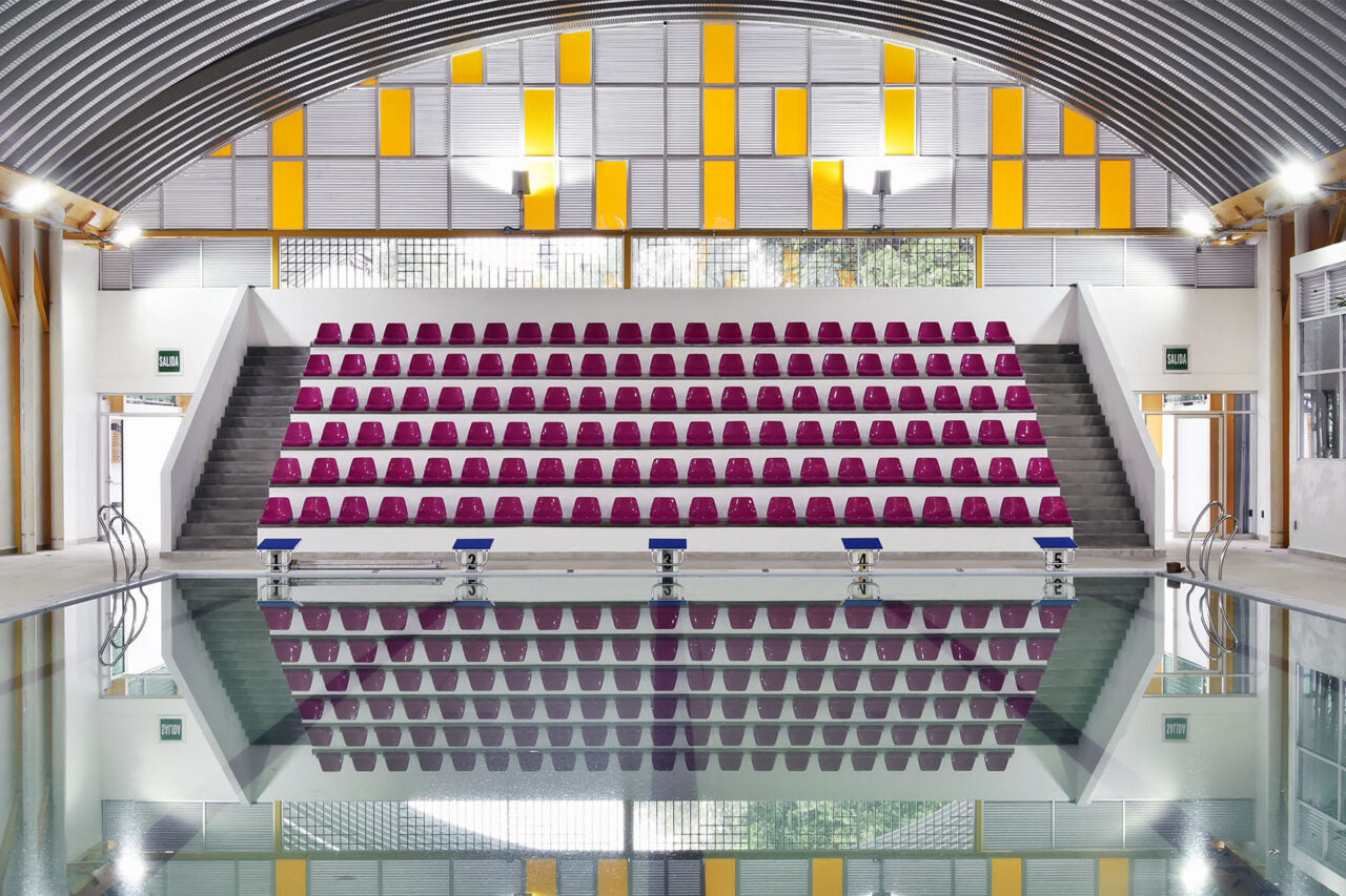 Seduta monoblocco con schienale alto, dimensionalmente conforme alle raccomandazioni FIFA/UEFA/FIBA.