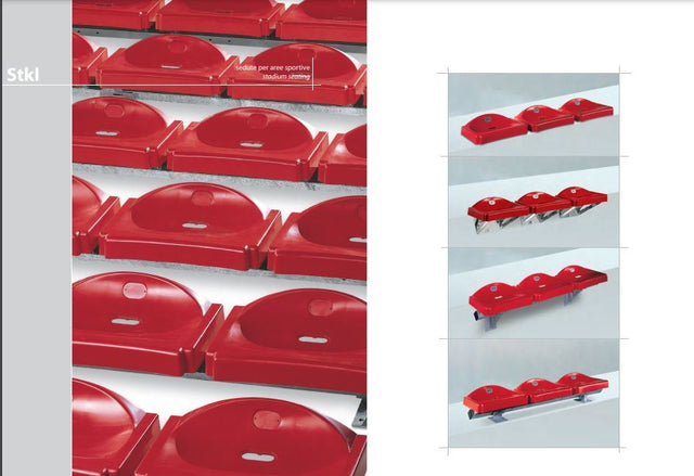 sedute per tribuna modello STKL, prodotta in copolimero di polipropilene (PP) di prima scelta, riciclabile al 100%, nella versione ignifuga di Classe 1 secondo normativa vigente, additivato con anti U.V., disponibili in uno dei colori di collana, atossici ed esenti da metalli pesanti; da fissare sulla pedata del gradone mediante piastra antivandalo zincato a caldo per esterni (inclusa) e con 3 tasselli ad espansione (non inclusi); tappo copri-foro di colore grigio scuro incluso, numerazione su targhetta in plastica da fissare tramite rivetti non inclusa; dimensioni di ingombro 475x350x140 mm. Certificazione: livello 4 secondo la norma EN12727.