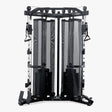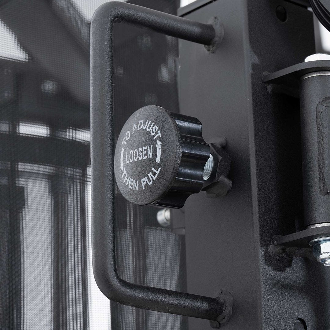 Dispone di una coppia di J-Hooks e di Safety Bars che consentono di lavorare ad esercizi con bilanciere, Include due maniglie in nylon Utilizzabile anche come rack libero, con l’innesto di un bilanciere, Sistema a doppia puleggia pivotante regolabile in altezza Design angolare compatto Due pacchi pesi da 73 kg Carter di protezione pacco pesi