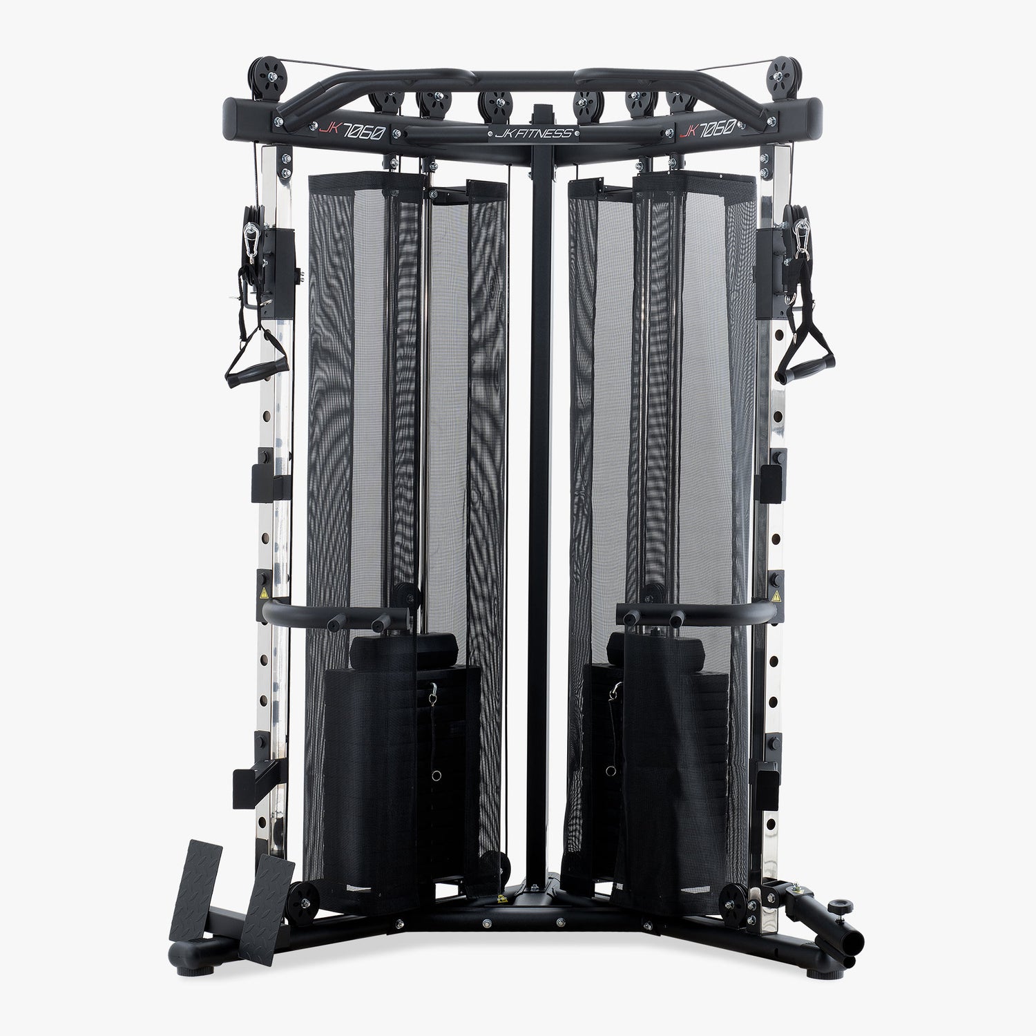 La multifunzione JK7060 può essere impiegata come power rack, dual pulley, smith machine, high/low pulley, pull-up bar, dip station, t-bar e anche come rack per dischi. Dispone di una serie completa di accessori tra cui una barra lat angolata, una barra seated row, 2 dip arm, una pedana poggiapiedi per pulley.