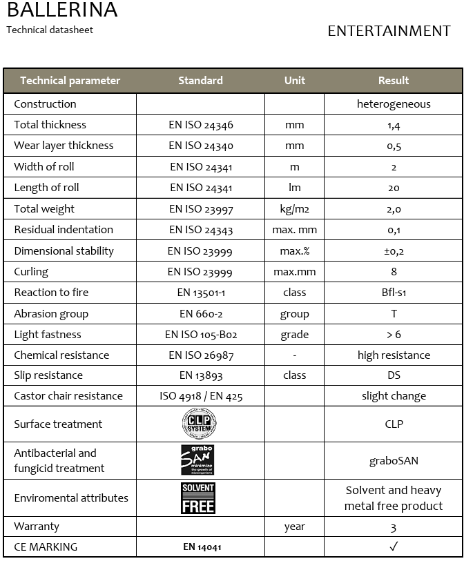 Ampia gamma di prodotti dalla danza a ogni tipo di area di intrattenimento senza solventi tecnologia di produzione ecologica e durata dimensionalmente stabile grazie al rinforzo in fibra di vetro facile da installare grazie alla flessibilità e al peso, per un'installazione portatile e permanente, nonché facile da pulire, il trattamento superficiale speciale garantisce che lo sporco ostinato possa essere rimosso facilmente mentre il colore e l'aspetto originali del pavimento vengono protetti.