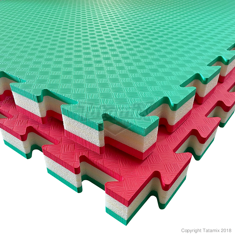 Una combinazione di EVA (lastre esterne) e POLIETILENE - XPE (lastre interne) vanno a creare una nuova tipologia di tatami sportivo, che unisce l'elevato assorbimento agli impatti delle lastre di Polietilene espanso alla morbidezza e resistena dell'Eva.
