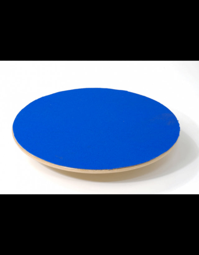 “Dondolo “”Bobath”” di legno. Piano di multistrati di legno verniciato al naturale e ricoperto in moquette, diametro cm 80, altezza totale cm 10.”