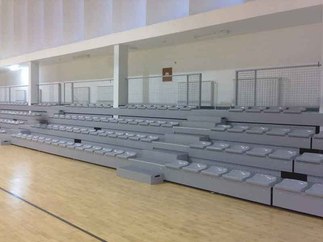 Tribuna telescopica per interni a movimentazione manuale o elettrica, struttura di acciaio verniciato.