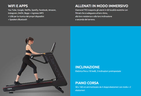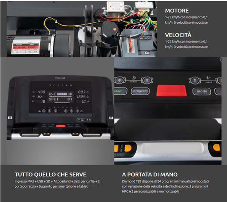 Tapis Roulant Diamond T88 per uso professionale motore da 4.0 HP AC continuativi 22 Km/h