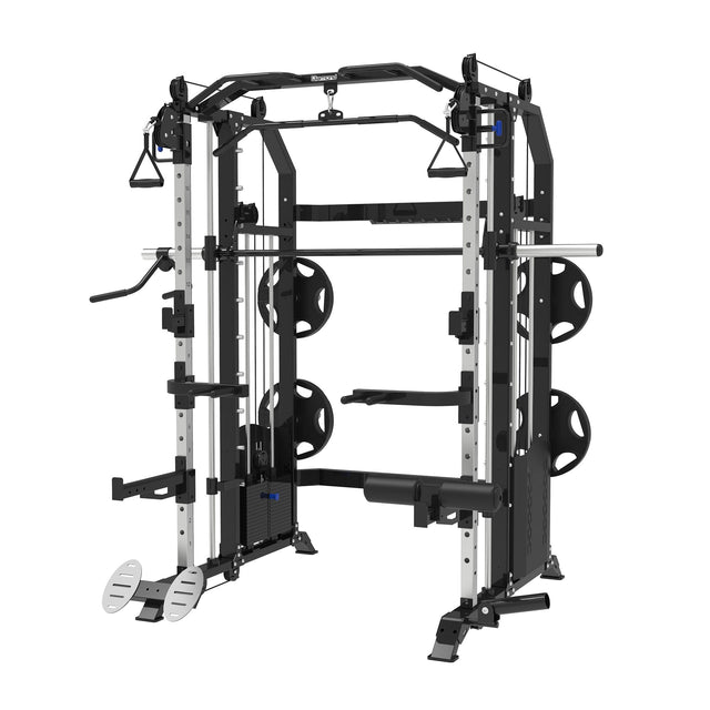 Il macchinario All In One è la perfetta stazione multifunzione con la quale sarà possibile allenare qualsiasi gruppo muscolare. Progettato per sostituire le macchine più popolari presenti in una qualsiasi palestra commerciale con il vantaggio di salvaguardare lo spazio d’ingombro senza perdere di funzionalità. Questo macchinario di fatti svolge le funzioni di: power rack, dual pulley, smith machine, high/low pulley, pull-up bar, dip station, t-bar, rack per dischi. La dual pulley dispone di 18 regolazioni. Movimento del bilanciere della smith machine tramite cuscinetti a sfera di alta qualità su guide lineari.