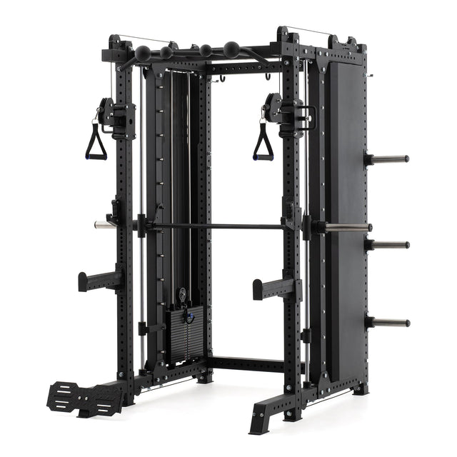 Il macchinario All In One è la perfetta stazione multifunzione con la quale sarà possibile allenare qualsiasi gruppo muscolare. Progettato per sostituire le macchine più popolari presenti in una qualsiasi palestra commerciale con il vantaggio di salvaguardare lo spazio d’ingombro senza perdere di funzionalità. Questo macchinario di fatti svolge le funzioni di: power rack, dual pulley, smith machine, high/low pulley, vertical leg press, pull-up bar, lever arms, dip station, t-bar, rack per dischi e bilanciere. La dual pulley dispone di 34 regolazioni. Movimento del bilanciere della smith machine tramite cuscinetti a sfera di alta qualità su guide lineari.