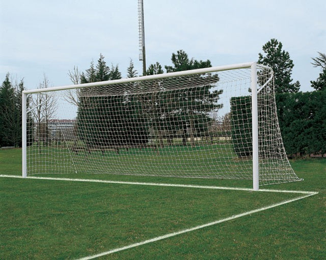 In alluminio anodizzato bianco. Profilo in alluminio pesante (kg 2,85 mtl) certificato “sistema qualità” secondo normativa DIN EN ISO 9002 rilasciata da TUV CERT con nervature interne di rinforzo, sezione ovale mm. 120x100, con bussole in alluminio da interrare. Traversa in due pezzi unita al centro con un profilo speciale di rinforzo. Reggirete a coda di rondine in tubolare acciaio zincato a caldo diam mm 35x2. Gancetti reggirete antinfortunistici, scorrevoli in apposito binario. A paio. Misure regolamentari cm 732x244. A norma UNI EN 748 (escluse reti).
