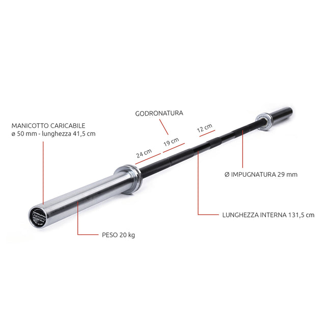 Bilanciere olimpionico da powerlifting con zigrinatura profonda anche centrale. Rivestimento con ossido di zinco ma non inclini alla ruggine come i bilancieri “standard”. Terminali hard chromed + impugnatura godronata antiscivolo da 29 mm.