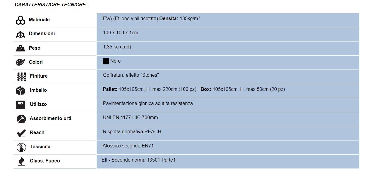 DESCRIZIONE : Realizzato in EVA espansa (etilene vinil acetato), a cellula chiusa ad alta densità, grande durata, resistente all’acqua con ottima elasticità. Estremamente solido e resistente, è consigliato per la realizzazione di pavimentazioni sulle quali posizionare macchinari ed attrezzature ginniche, adatto anche ad essere utilizzato indossando calzature ginniche.
